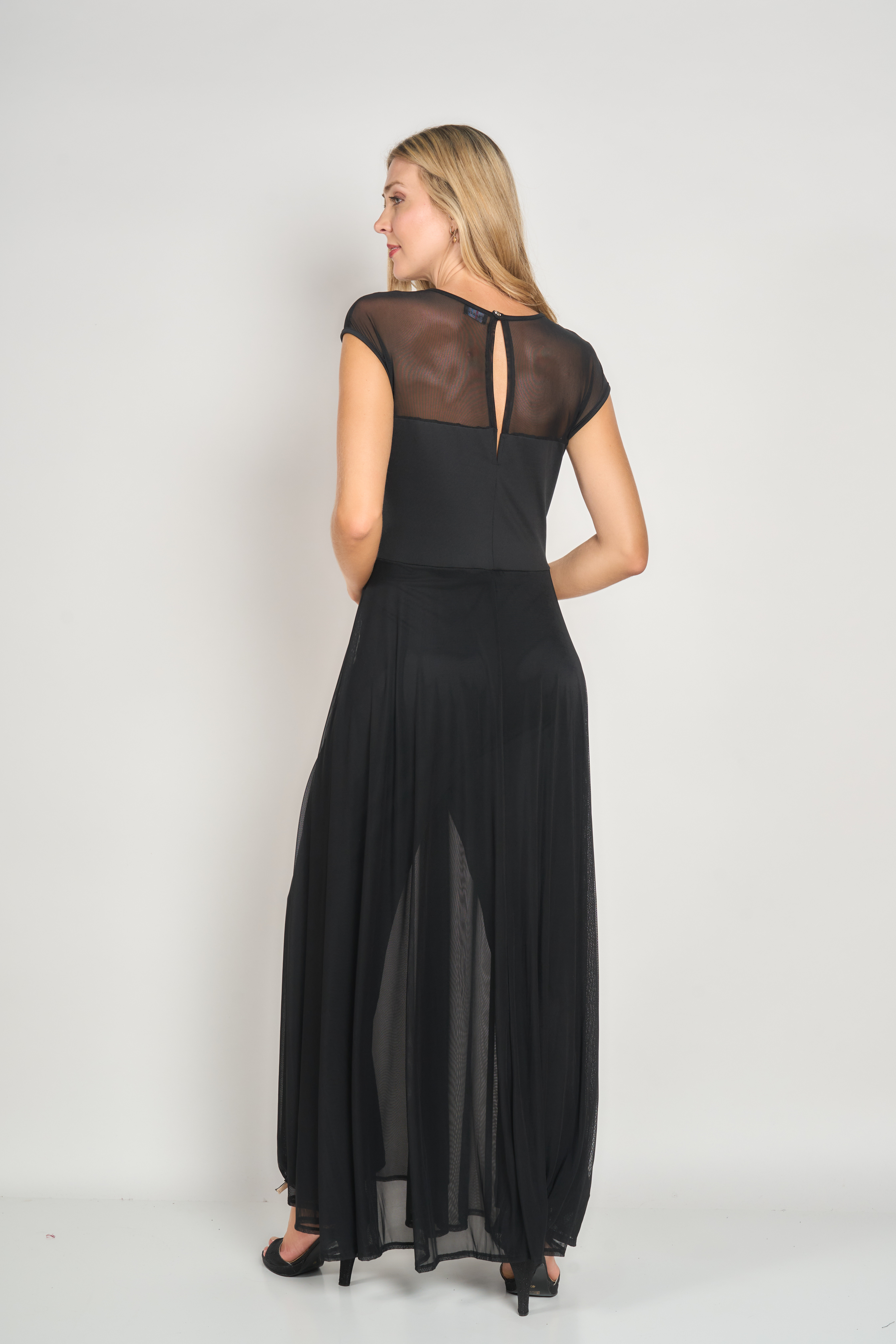 MONO LILIAN. ESCOTE BASE CON RECORTE COMBINADO TULL Y VIVO GROSS CON LUREX, SIN MANGAS, DETALLE APLIQUE FALDA. TEJIDO VENECIA LISO.