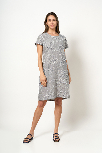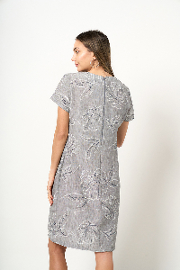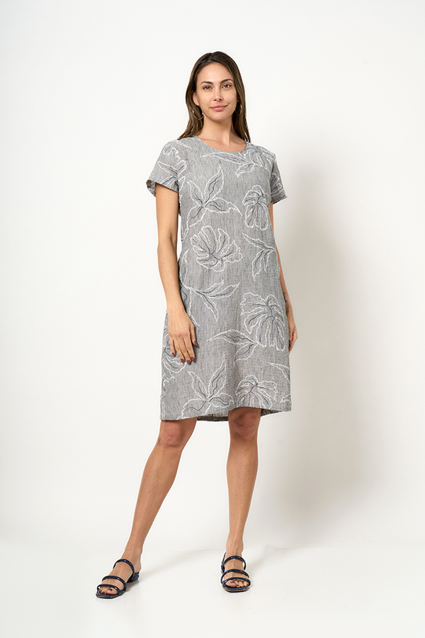 VESTIDO JACKIE CHARLIZE . ESCOTE BASE CON MANGA CORTA, DETALLE RECORTE EN BUSTO Y CINTURA. TEJIDO LINO BORDADO HOJAS CON LINEAS ESTAMPADAS.