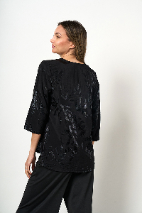 BLUSA ISABELLA. ESCOTE V CON MANGA 3/4. TEJIDO NYLON RAYON LISO, DIBUJOS PINCELADAS DE LUREX.
