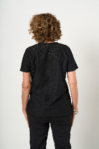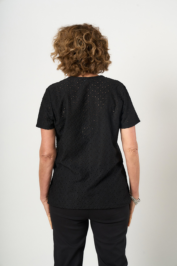 REMERA INGRID CLASICA. ESCOTE BASE Y MANGA CORTA, TEJIDO BRODERIE LISO.