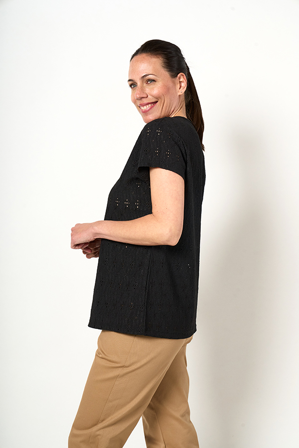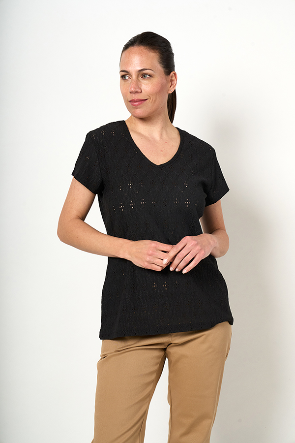 REMERA ALEXANDRA CLASICA. ESCOTE V Y MANGA CORTA, TEJIDO BRODERIE LISO.