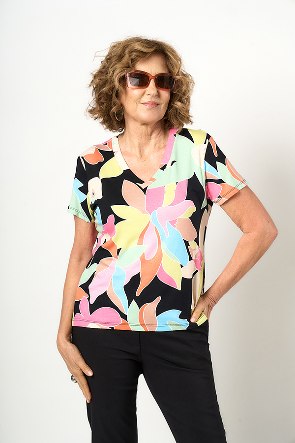 REMERA CHLOE. CLASICA, ESCOTE V Y MANGA CORTA. TEJIDO MODAL CREPE ESTAMPADO FLORES.