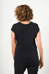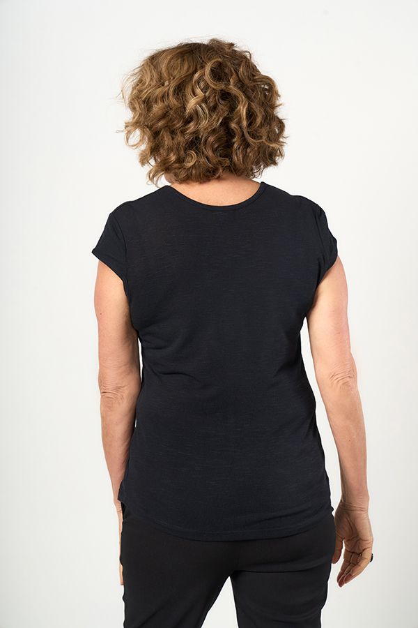REMERA OLIVIA. ESCOTE V SIMULA CARDIGAN CON 3 PRENDEDORES Y MANGA JAPONESA. TEJIDO MODAL FLAME ROMA LISO.