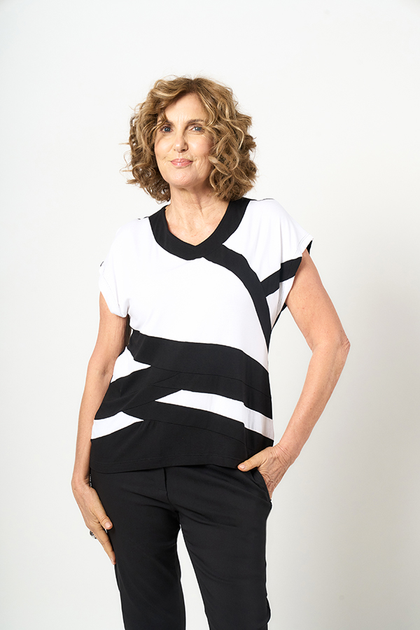 REMERA VICTORIA. ESCOTE V INCRUSTRADO Y MANGA JAPONESA, FRENTE MULTIRECORTES COMBINADO. TEJIDO MODAL CREPE LISO.