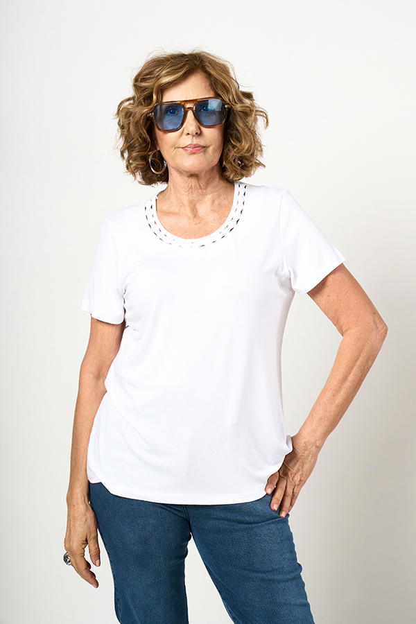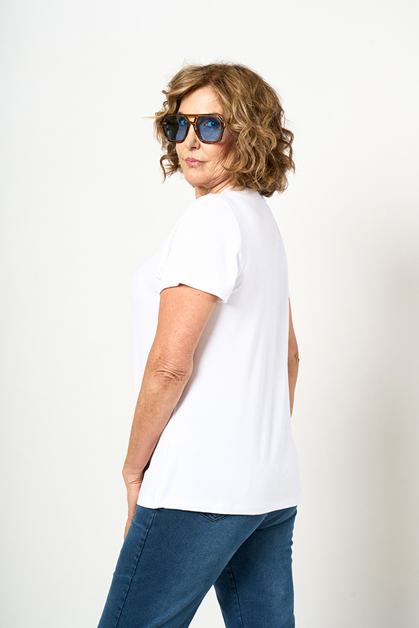 REMERA DANNA. ESCOTE BASE CON TIRITAS TRENZADAS Y MANGA CORTA. TEJIDO MODAL CREPE LISO.
