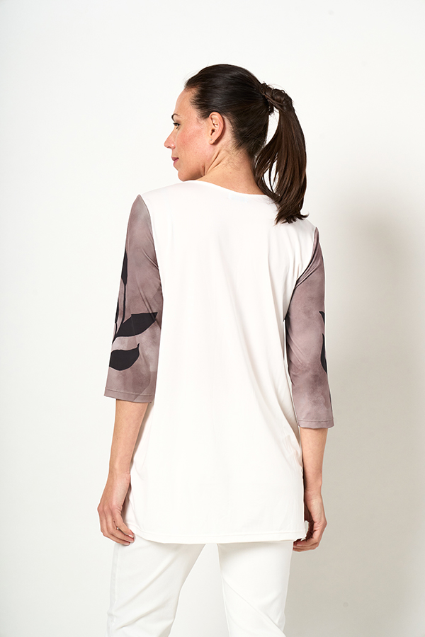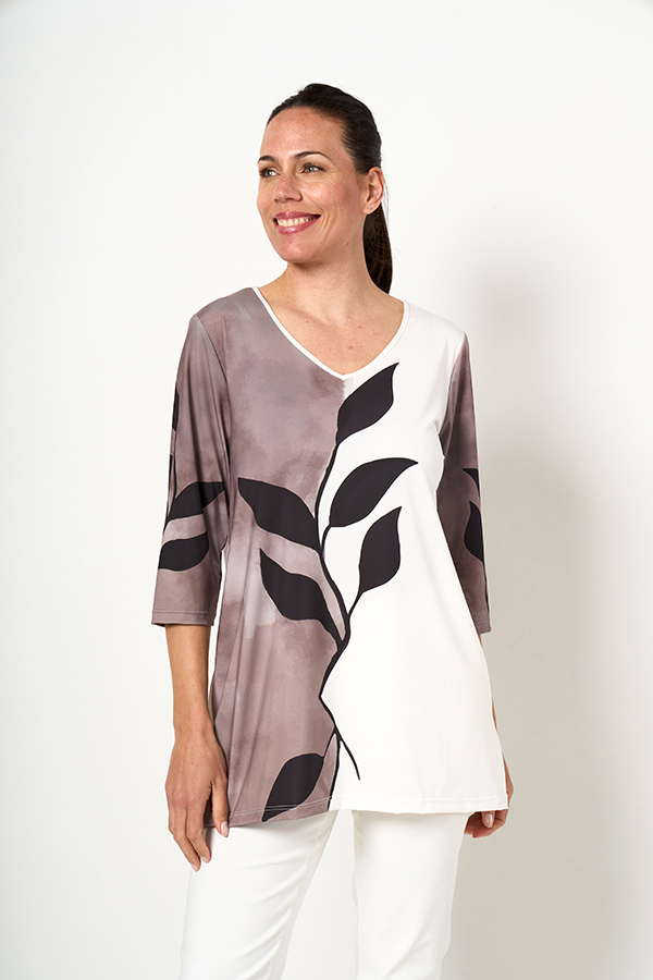 REMERA MALU. ESCOTE V Y MANGA 3/4 COMBINADAS BICOLOR CON ESTAMPA HOJAS. TEJIDO VENECIA NAPOLES LISA.
