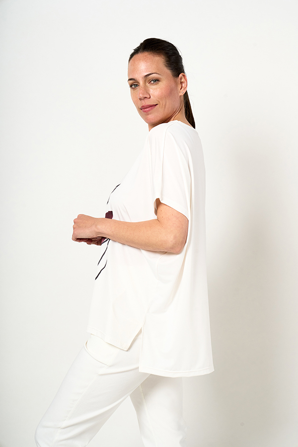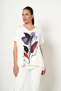 REMERA MALU. ESCOTE V Y MANGA 3/4 COMBINADAS BICOLOR CON ESTAMPA HOJAS. TEJIDO VENECIA NAPOLES LISA.