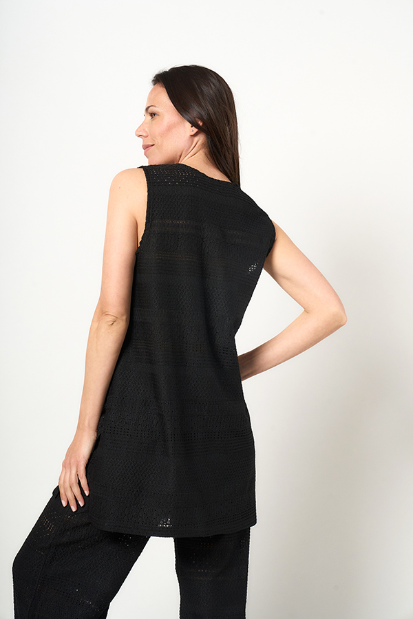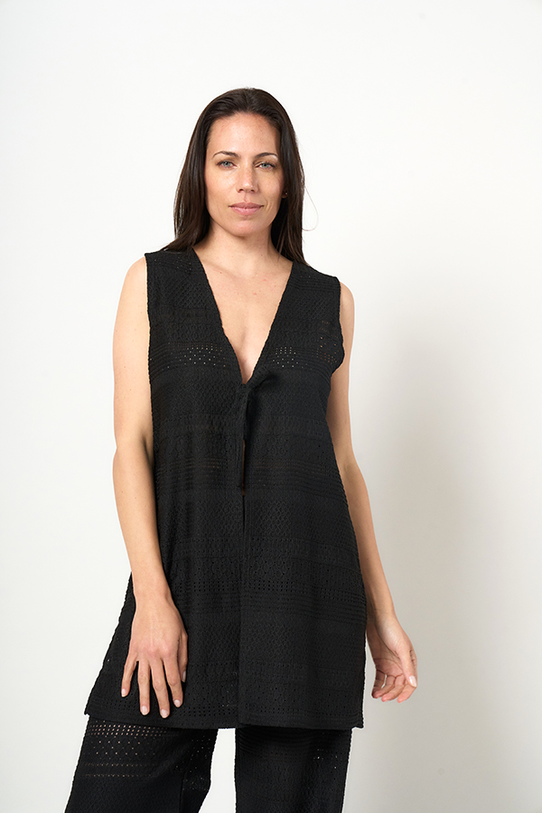 CHALECO LARGO FELICITAS. ESCOTE V CON DETALLE TIRITAS PARA ATAR. TEJIDO BRODERIE DE PUNTO LISO.