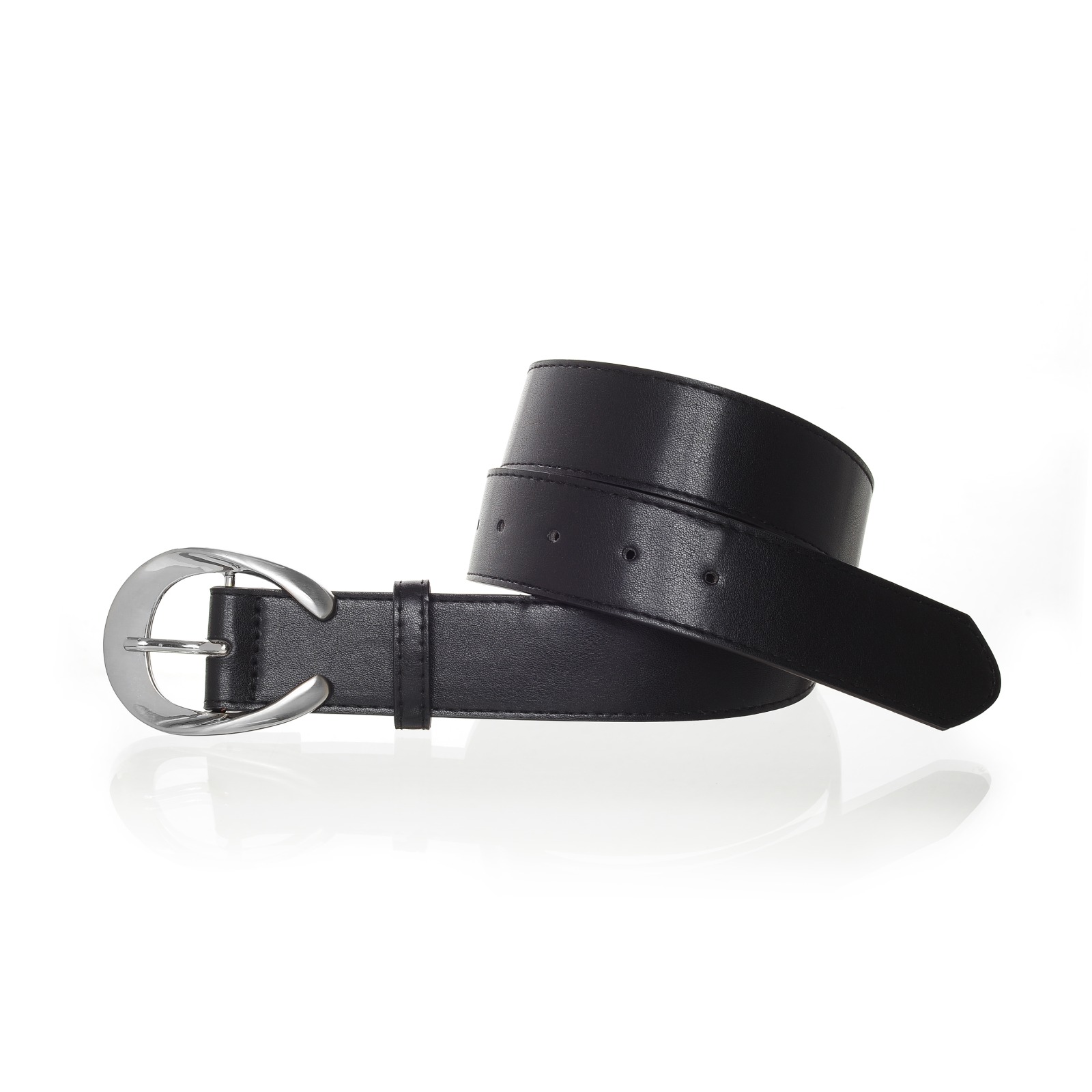 CINTURON SOL. CLASICO, HEBILLA OVALADA REDONDEADA DE METAL PLATEADA CON PRESILLA . TEJIDO SIMIL CUERO LISO