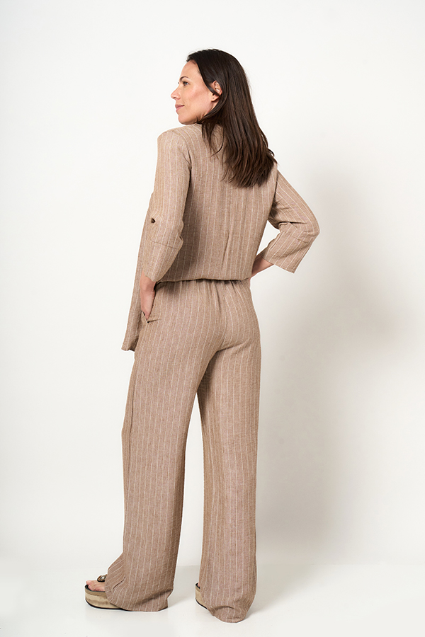 PANTALON ESMERALDA RECTO. CINTURA CON ELASTICO Y BOLSILLOS DIAGONALES. TEJIDO LINO RAYON TIZADO.