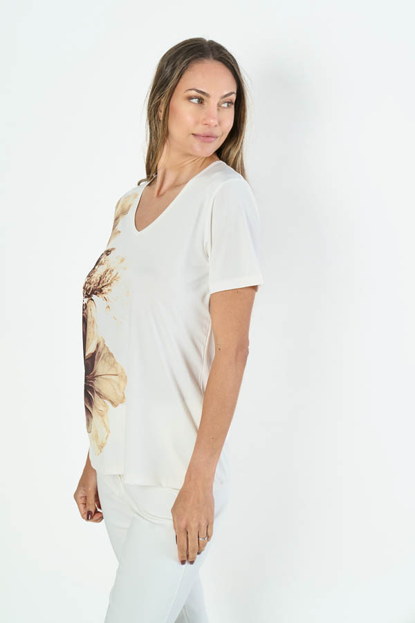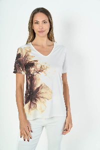 REMERA BRUNELLA. ESCOTE V Y MANGA CORTA, DETALLE DIBUJO FLORES EN FRENTE Y MANGA. TEJIDO VENECIA NAPOLES LISO.