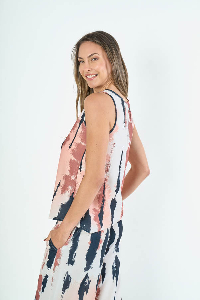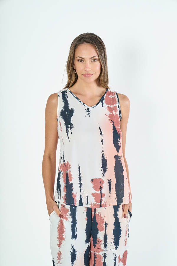 MUSCULOSA NAIARA. ESCOTE V CON DETALLE TERMINACION SIMIL EVASE. TEJIDO CREPE ESTAMPADO MANCHAS ESFUMADO.