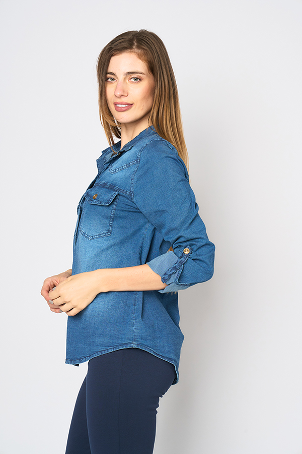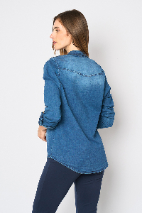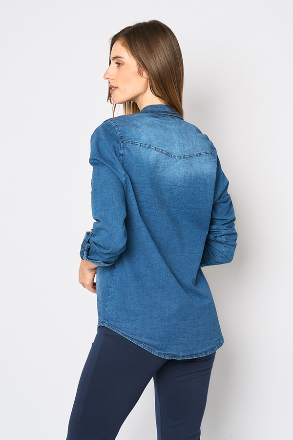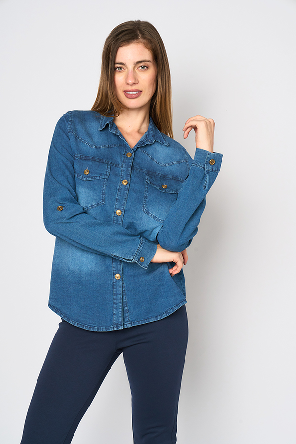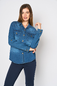 CAMISA GIANNINA. CUELLO SOLAPA Y MANGA LARGA CON TRABA, DETALLE FRENTE CON DOS BOLSILLOS PLAQUE. TEJIDO JEANS LIVIANO PESPUNTEADO.