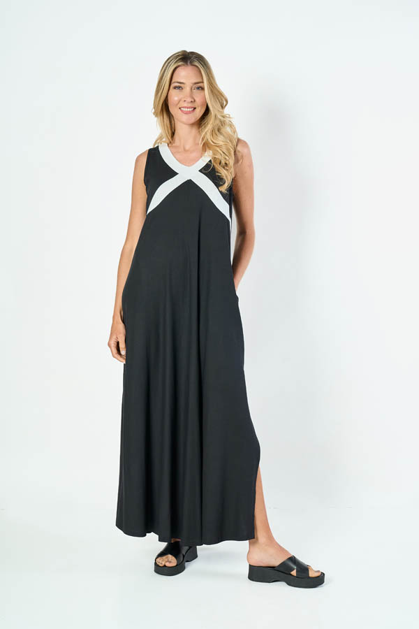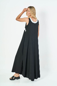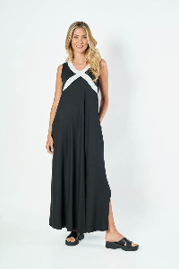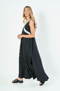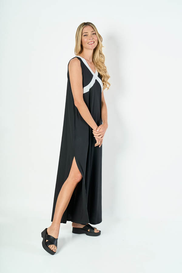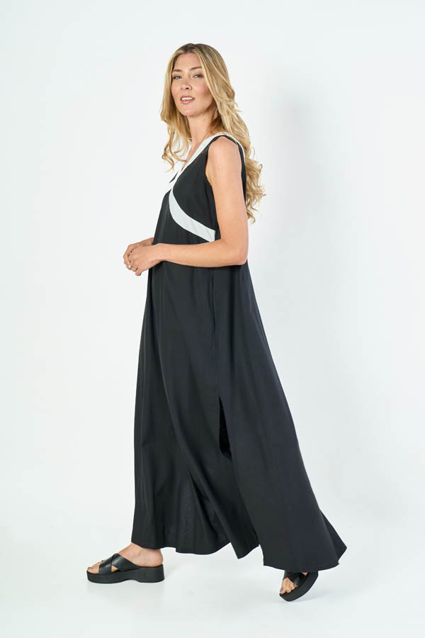 VESTIDO MILAGRO LARGO. ESCOTE V CON RECORTES COMBINADOS MODAL, SIN MANGA. DETALLE BOLSILLOS LATERALES CON TERMINACION TAJOS A LOS COSTADOS. TEJIDO LINO CON SPANDEX Y MODAL CREPE LISO.