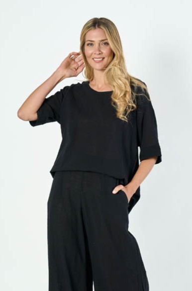 TUNICA BERNARDA. ESCOTE BASE Y MANGA DOLMAN CON PUÃO, TERMINACION TAJITOS A LOS COSTADOS. TEJIDO MARRAKECH COTTON SLUB LISO.