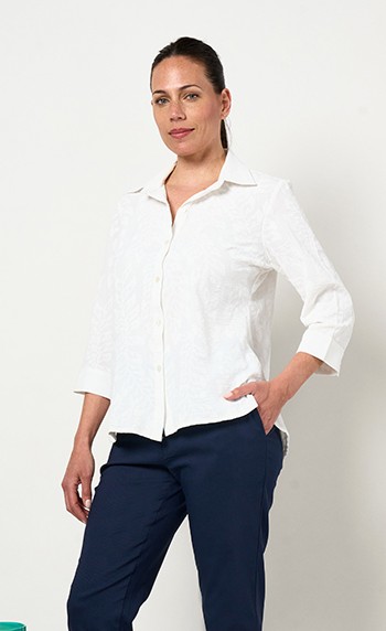 CAMISA ROXANA. CLASICA, CUELLO SOLAPA Y MANGA 3/4, DETALLE TAJITOS A LOS COSTADOS. TEJIDO CAMISERO ESTAMPADO SIMIL BORDADO HOJAS.
