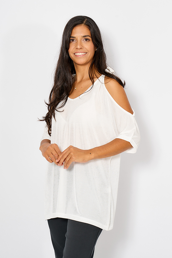 REMERA PAULINA. ESCOTE V Y MANGA DOLMAN CON HOMBRO DESCUBIERTO Y DETALLE NUDO, TERMINACION EVASE. TEJIDO ACETATO LISO.