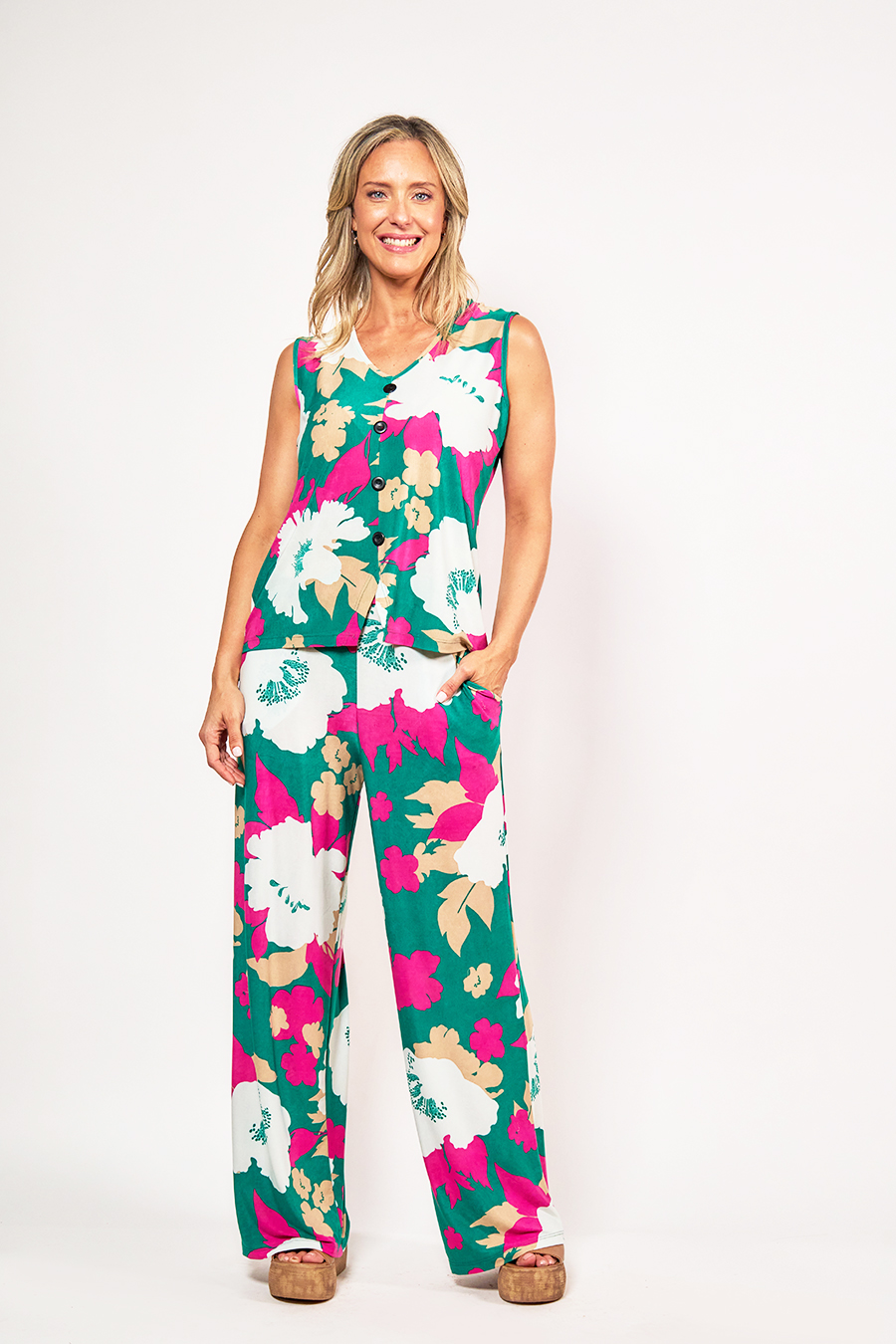 PANTALON PALAZZO CRISTAL. CINTURA CON ELASTICO Y BOLSILLOS LATERALES. TEJIDO VENECIA ESTAMPADO FLORES.
