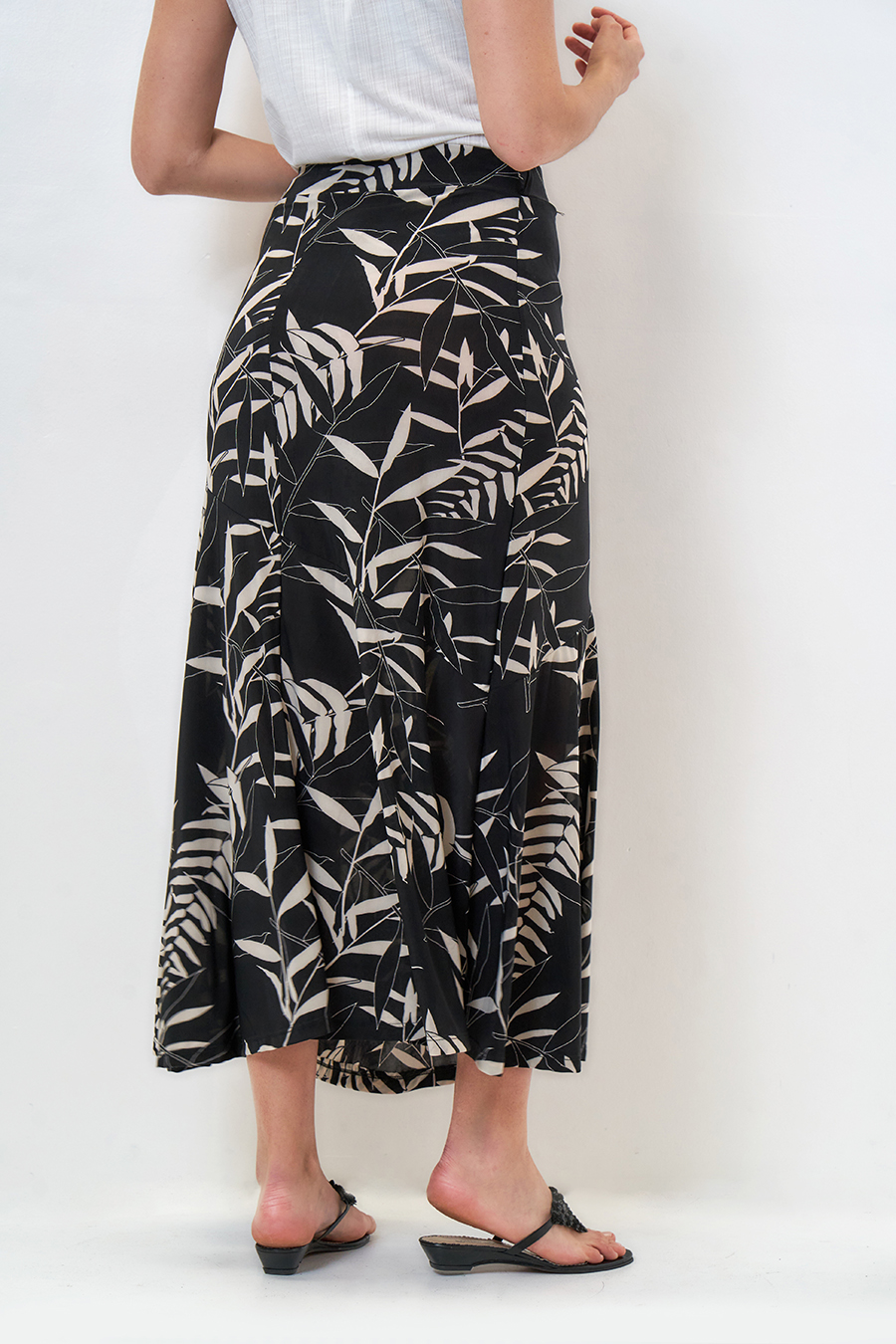 POLLERA IRIS LARGA. CINTURA CON ELASTICO Y PRESILLAS CON DETALLE LAZO; TERMINACION EVASE CON RECORTES. TEJIDO VENECIA ESTAMPADO HOJAS.