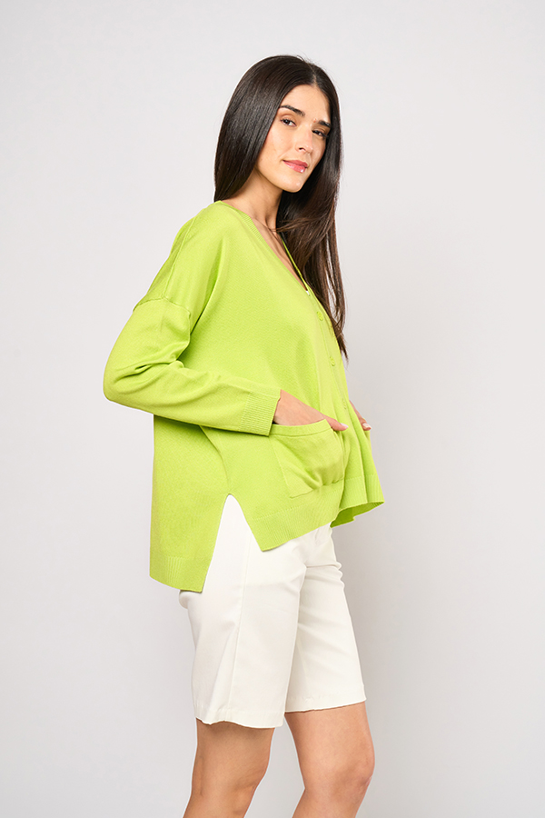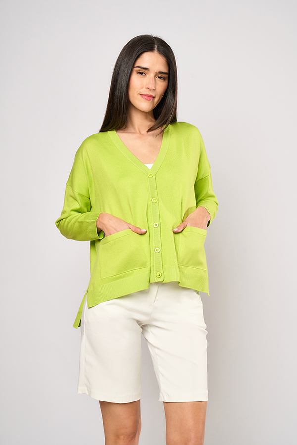 CARDIGAN OVERSIZE DENISSE. ESCOTE V Y MANGA LARGA, DETALLE FRENTE CON BOLSILLOS PLAQUE Y TERMINACION IRREGULAR. TEJIDO SPANDEX LISO.