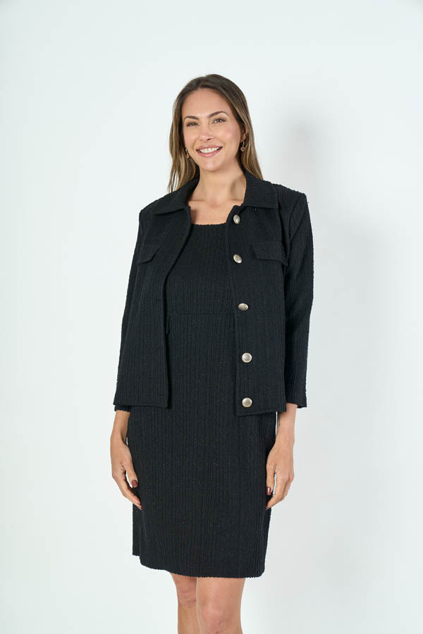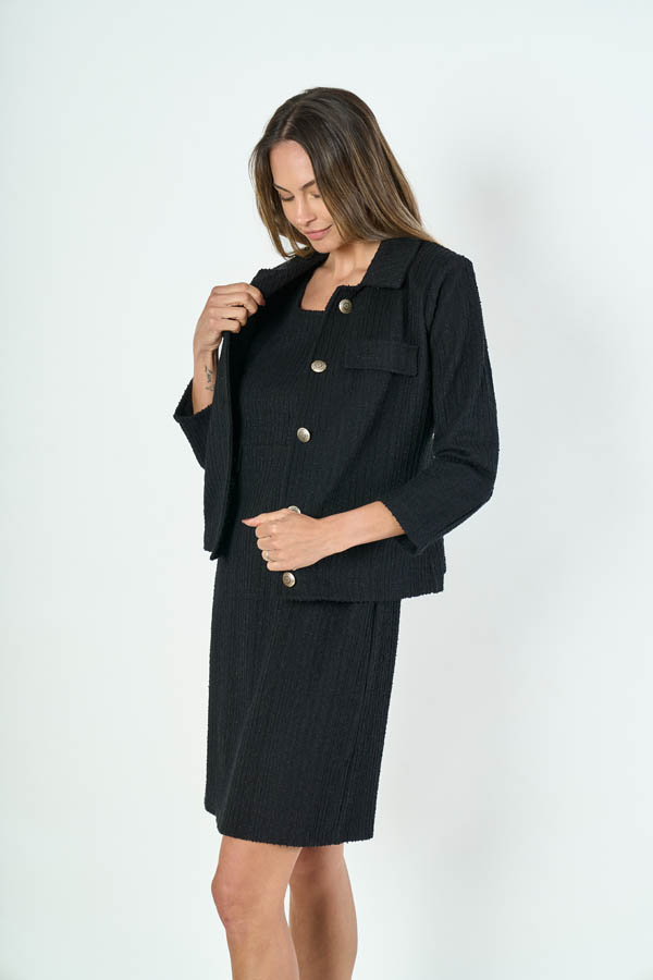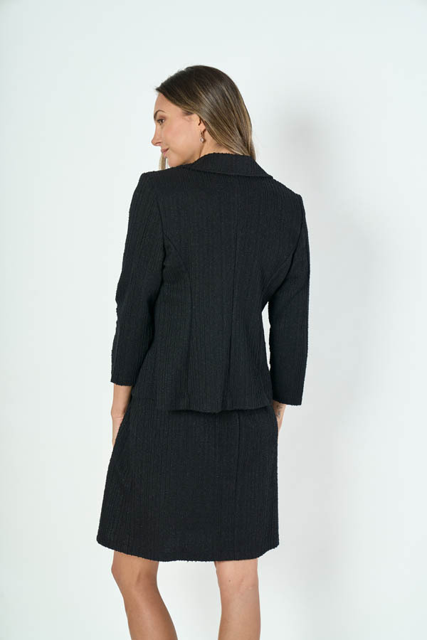 CHAQUETA ANA CLARA. CUELLO SOLAPA Y MANGA 3/4, DETALLE FRENTE SIMULA BOLSILLO CON TAPITAS. TEJIDO FANTASIA CHANNEL CON LUREX.