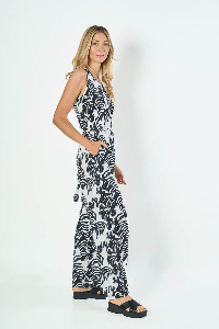 MONO ANDREINA. ESCOTE U SIN MANGAS. ESPALDA DETALLE LAGRIMA, CINTURA CON LAZITO PARA ATAR Y BOLSILLOS LATERALES. TEJIDO VISCOSA ESTAMPADO HOJAS.