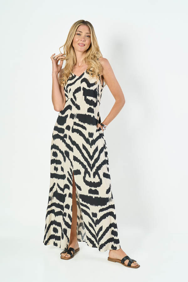 VESTIDO PETRA LARGO. ESCOTE V SIN MANGAS Y BOLSILLOS, CINTURA CON ELASTICO Y LAZO, DETALLE FRENTE CON TAJO. TEJIDO VISCOSA ESTAMPADA.