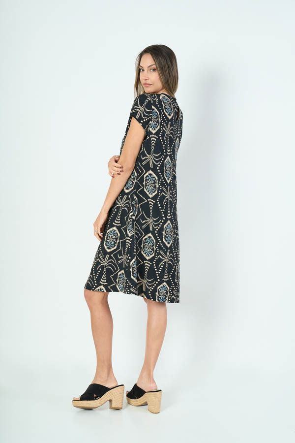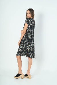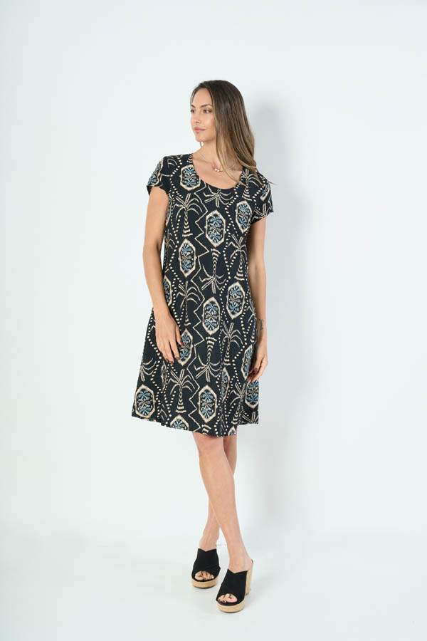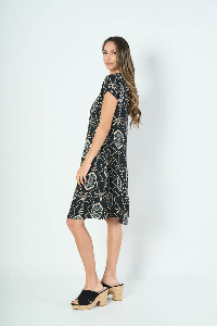 VESTIDO SILVIA. ESCOTE U CON MEDIA MANGA, TERMINACION EVASEE. TEJIDO VISCOSA ESTAMPADA.