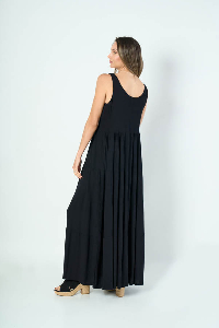 VESTIDO TRIANA LARGO. ESCOTE U SIN MANGAS, DETALLE FALDA 4 VOLADOS. TEJIDO LINO SLUB LISO.