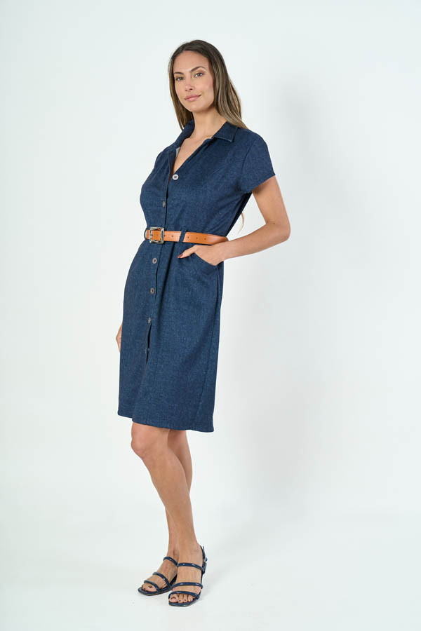 VESTIDO CHEMISE NADIA. CUELLO SOLAPA CON MANGA CORTA, RECORTE ENTALLADO CON PESPUNTE, CINTURA CON PRESILLAS Y BOLSILLOS LATERALES. TEJIDO PUNTO ROMA DENIM LISO.