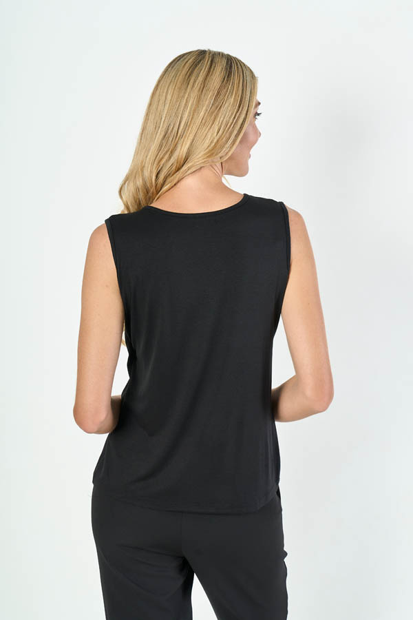 MUSCULOSA CAMILA. ESCOTE U, DETALLE DRAPEADO Y ACCESORIO EN UN HOMBRO. TEJIDO MODAL CREPE LISO.