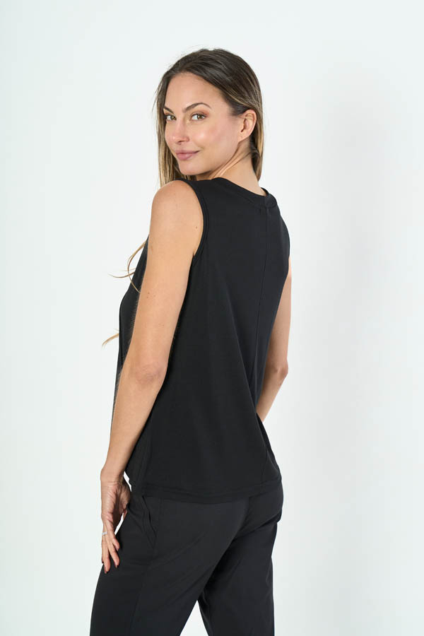 REMERA EMMA. ESCOTE U INCRUSTADO SIN MANGAS, FRENTE RECORTES CON ALFORZAS. TEJIDO MODAL CREPE LISO.