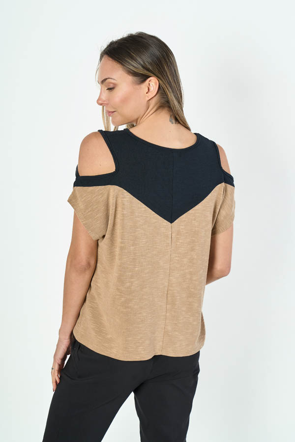 REMERA RENATA. ESCOTE BASE CON RECORTE COMBINADO Y MANGA JAPONESA. DETALLE HOMBROS DESCUBIERTOS. TEJIDO MODAL FLAME LISO.
