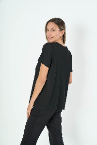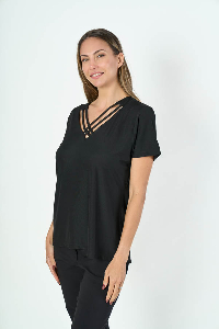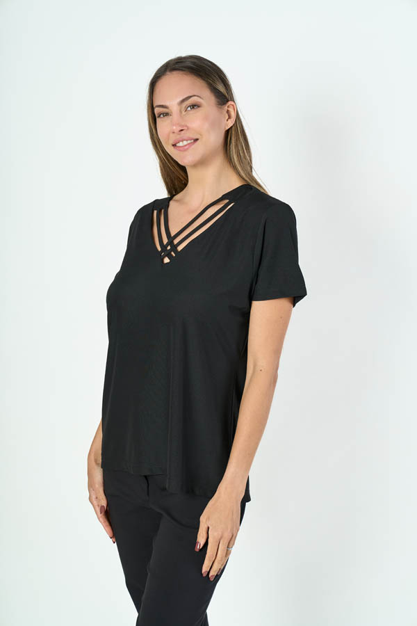 REMERA MICAELA. ESCOTE FANTASIA CON TIRITAS ENTRECRUZADAS. TEJIDO MICRO MORLEY LISO.