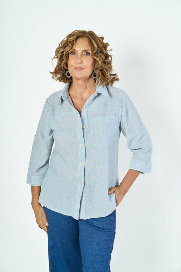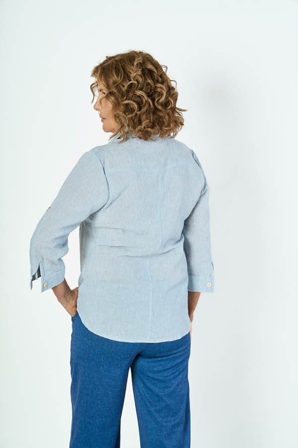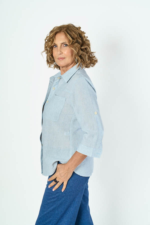 CAMISACO AINHOA. CUELLO SOLAPA Y MANGA 3/4 CON TRABA. FRENTE CON RECORTE, DETALLE UN BOLSILLO PLAQUE. TEJIDO POLINEN MELANGE LISO.