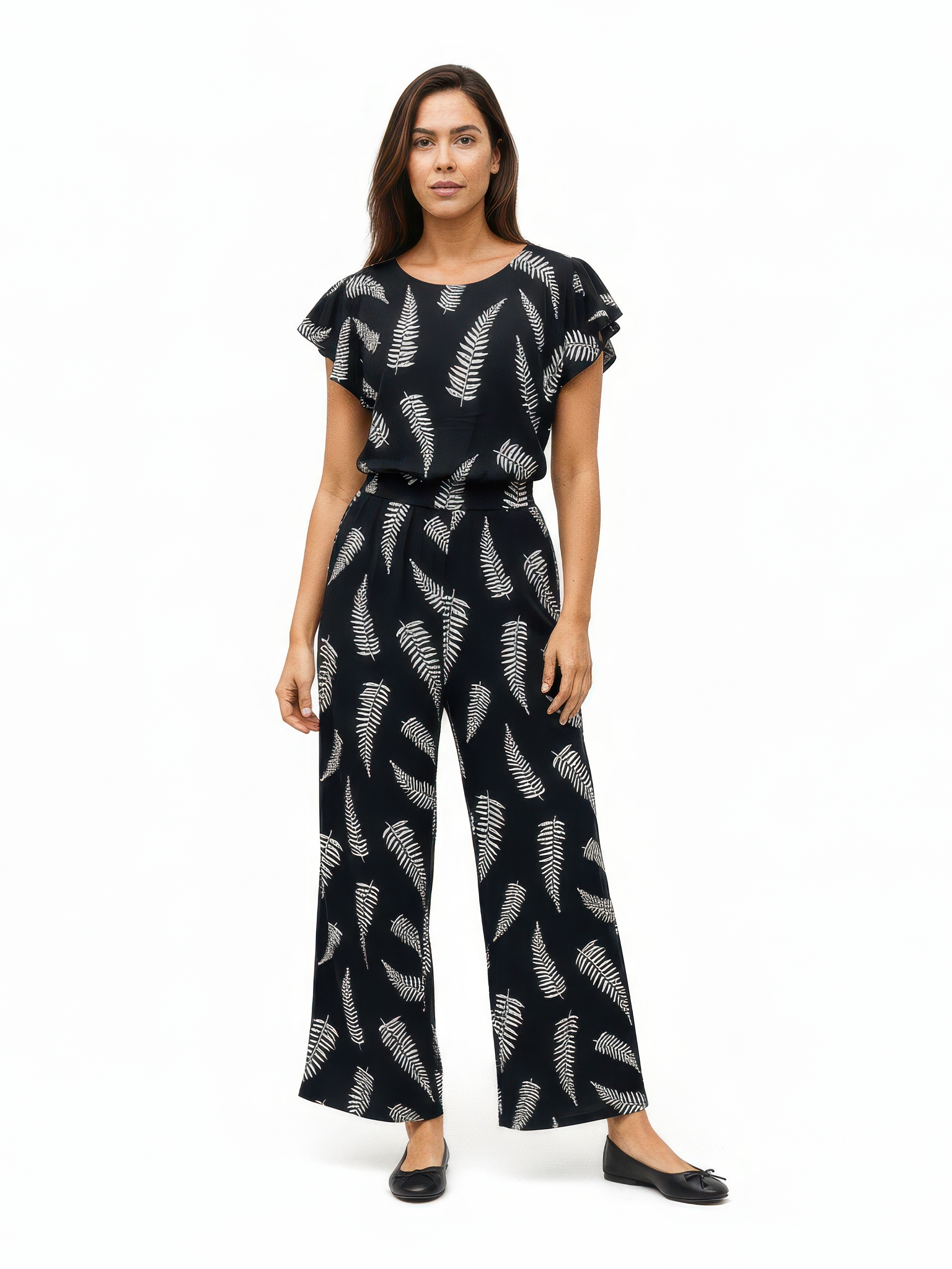 Pantalón Palazzo Loreley , con cintura con elástico trasero y bolsillos laterales. Confeccionado en tejido CEY estampado espigas, es cómodo, elegante y perfecto para un look moderno y sofisticado.
