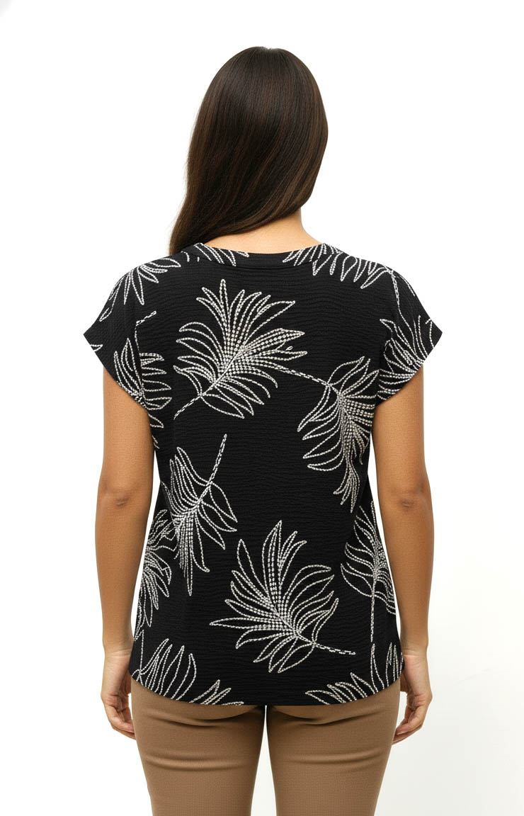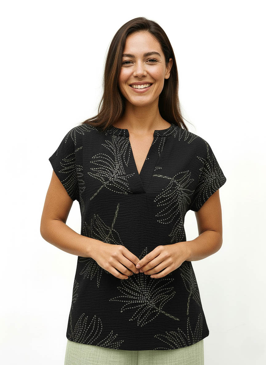 Líneas limpias y diseño actual. La Blusa Elida incorpora cuello mao y manga japonesa, creando una silueta relajada y sofisticada. Confeccionada en tejido Cey símil bordado hojas, ligero y con textura sutil.