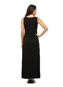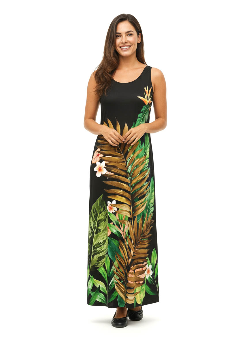 Vestido Margarita. Largo y liviano, con escote base sin mangas y estampa selvática al frente. Confeccionado en microfibra, ideal para un look fresco, moderno y con personalidad.