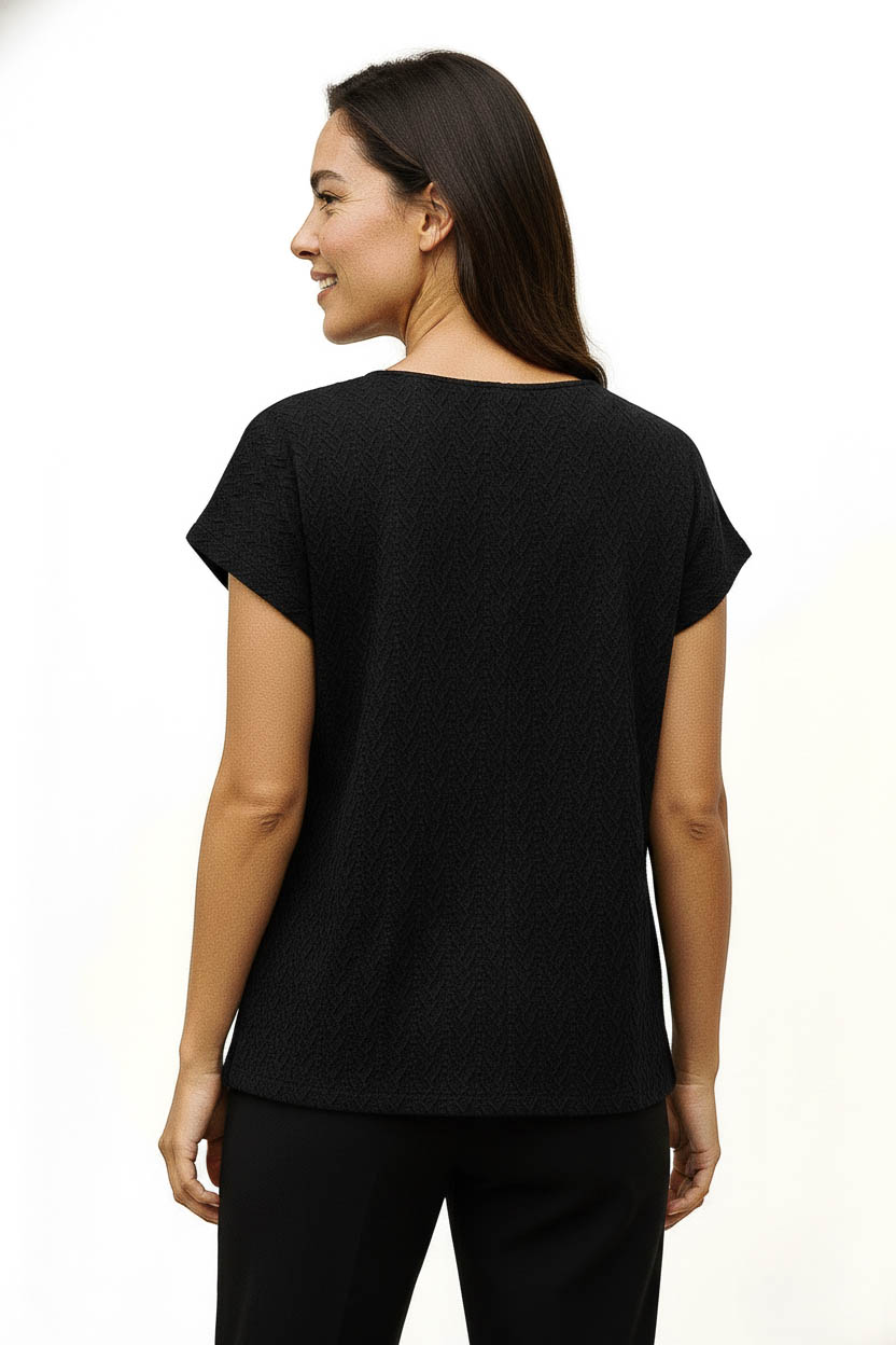 Remera Selene. Con escote fantasía y manga japonesa, destaca por su diseño de rectángulos intercalados. Confeccionada en broderie de punto liso, suma un toque moderno y canchero a cualquier look.