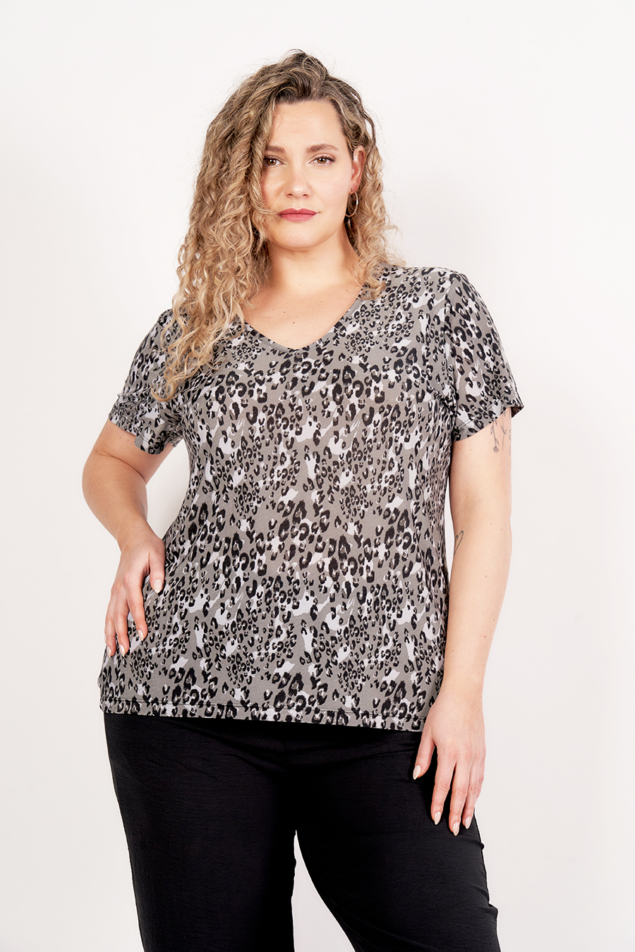 63 REMERA AMALIA. ESCOTE V Y MANGA CORTA, CLASICA. TEJIDO VENECIA ESTAMPADO ANIMAL PRINT.