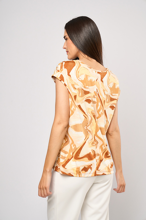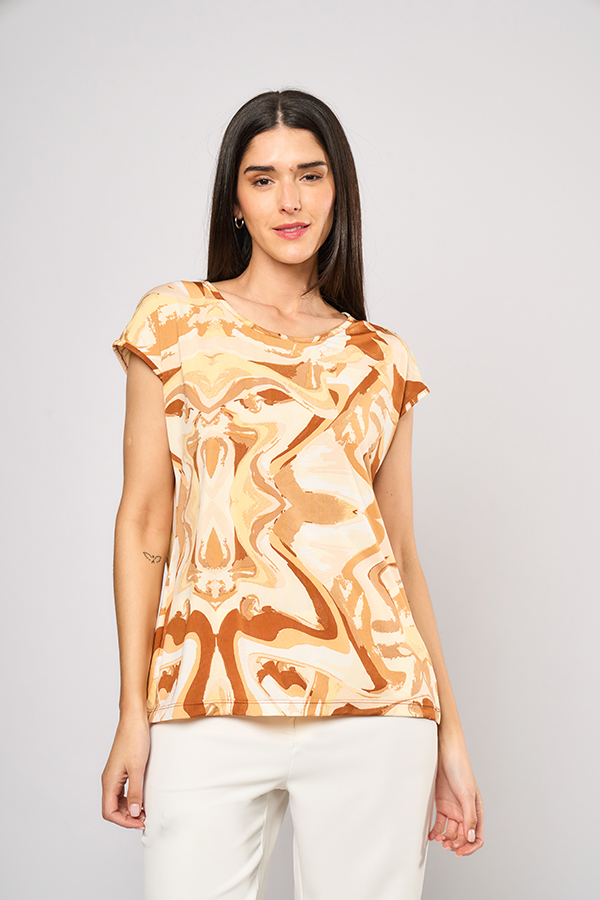 38 REMERA BRITNEY. ESCOTE BASE CON MANGA CAIDA. TEJIDO VENECIA ESTAMPADA.