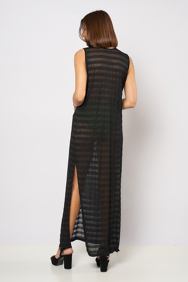 134 REMERA PLAYERA DONATELLA. ESCOTE V, SIN MANGAS. DETALLE TERMINACION CON TAJITOS A LOS COSTADOS. TEJIDO ENCAJE DESAHUJADO.