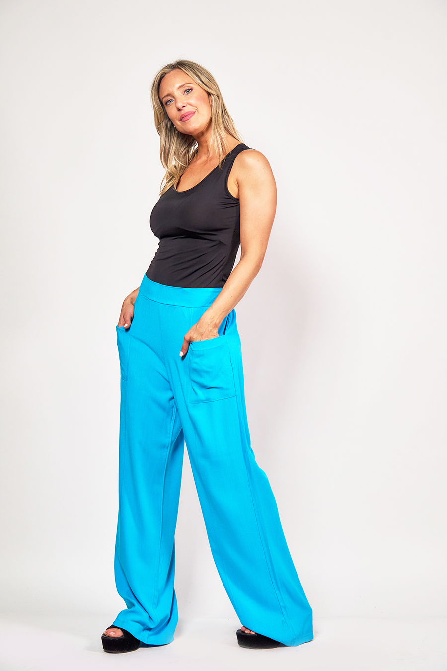145 PANTALON PALAZZO LEILA. CINTURA CON ELASTICO TRASERO, DETALLE FRENTE CON RECORTE PESPUNTEADO Y BOLSILLOS PLAQUE. TEJIDO LINO SLUB LISO.
