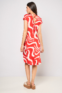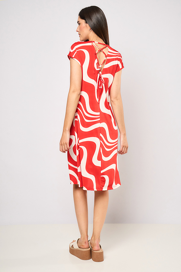 35 VESTIDO GWEN. ESCOTE V Y BUSTIER CON RECORTE DRAPEADO, MANGA JAPONESA. ESPALDA CON TIRAS ENTRECRUZADAS. VENECIA ESTAMPADO ONDAS.