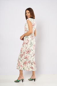100 VESTIDO AYLIN. ESCOTE CRUZADO CON MANGA JAPONESA, DETALLE CINTURA CON RECORTE Y LAZO. TERMINACION CON VOLADOS. TEJIDO LINO ESTAMPADO FLOR DE LOTO.