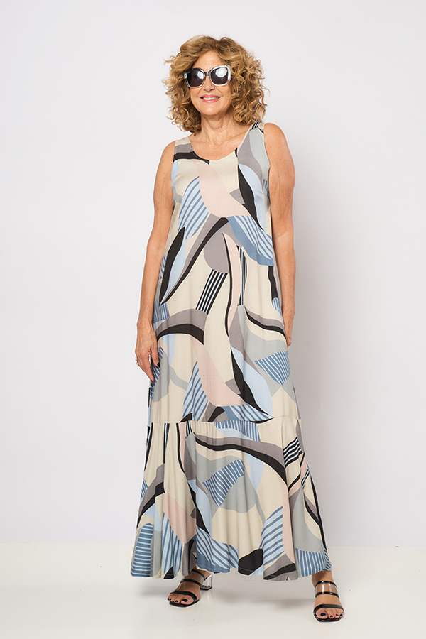 104 VESTIDO LUANA LARGO. ESCOTE U SIN MANGAS, TERMINACION RECORTE CON VOLADOS. TEJIDO VILLELA ESTAMPADO.