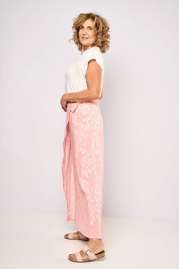 12 POLLERA BIANCA LARGA. CINTURA CON ELASTICO, DETALLE FRENTE CRUZADO SIMIL PORTAFOLIO. LINO ESTAMPADO MANCHITAS.
