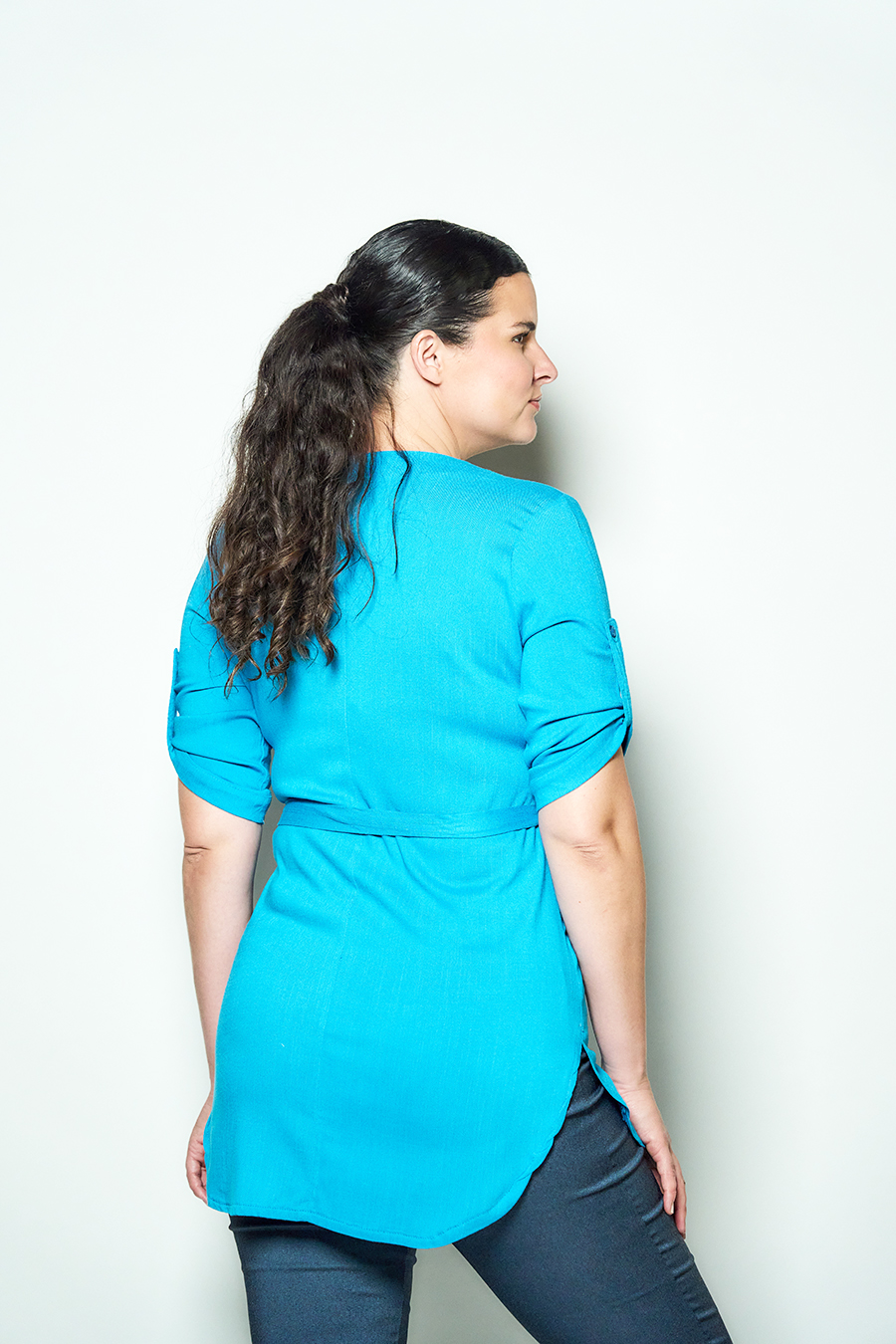 96 CAMISOLA MIMI. ESCOTE V INCLINADO Y MANGA 3/4 CON TRABA. DETALLE FRENTE CON BOLSILLO PLAQUE Y TERMINACION EVASE CON LAZO. TEJIDO LINO SLUB LISO.