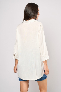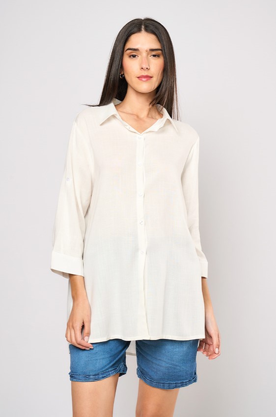 33 CAMISOLA FATIMA. CLASICA, CUELLO SOLAPA Y MANGA 3/4 CON TRABA. TEJIDO LINO SLUB LISO.