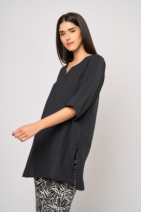 99 TUNICA LUCIA. ESCOTE FANTASIA Y MANGA 3/4 CON TRABA, DETALLE TERMINACION TAJITOS A LOS COSTADOS. TEJIDO CEY KENIA LISO.
